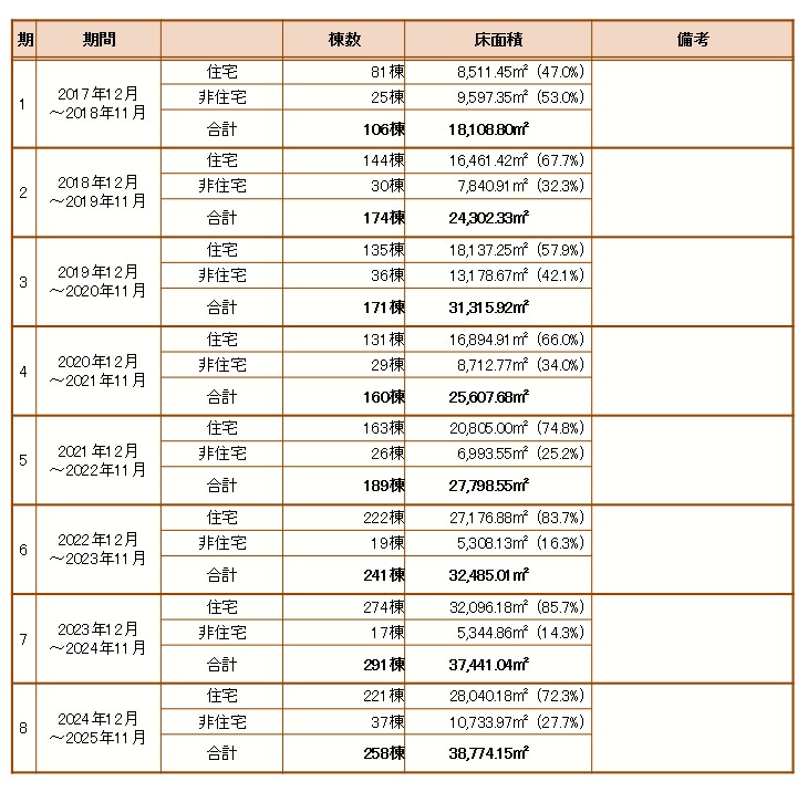法人化後の年間構造設計実績を表示します。当事務所では中大規模木造を含む木造非住宅の割合は32~50%の間で推移していましたが、5期以降はコロナ禍の影響で非住宅物件が減少した一方、4号特例縮小を見越して自主的に許容応力度計算を実施する需要が増大しています。非住宅の延べ床面積ベースでは減少していますが、15~18mスパンクラスの木造トラスや傾斜地人工地盤を用いた木造小学校、混構造など、より高度な中大規模木造の物件が増えています。8期では非住宅系が大きく伸びました。
